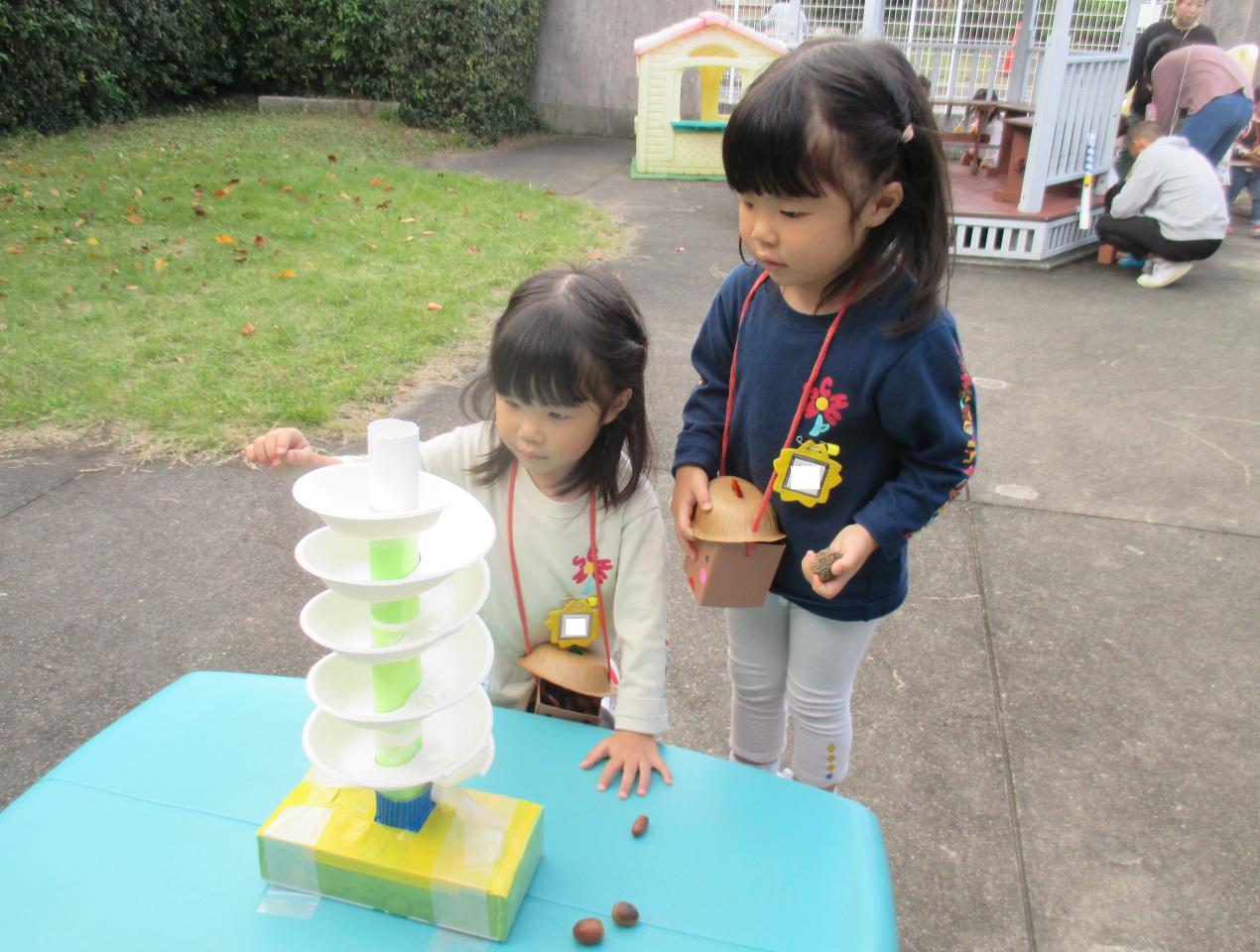 いろいろなコースターや仕掛けを何度も何度も繰り返し楽しみ、帰りにはどんぐりがいっぱい入ったバッグをとっても大事そうに持ってくれていました(^^♪