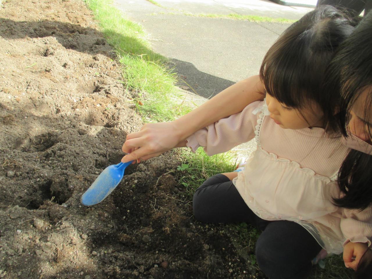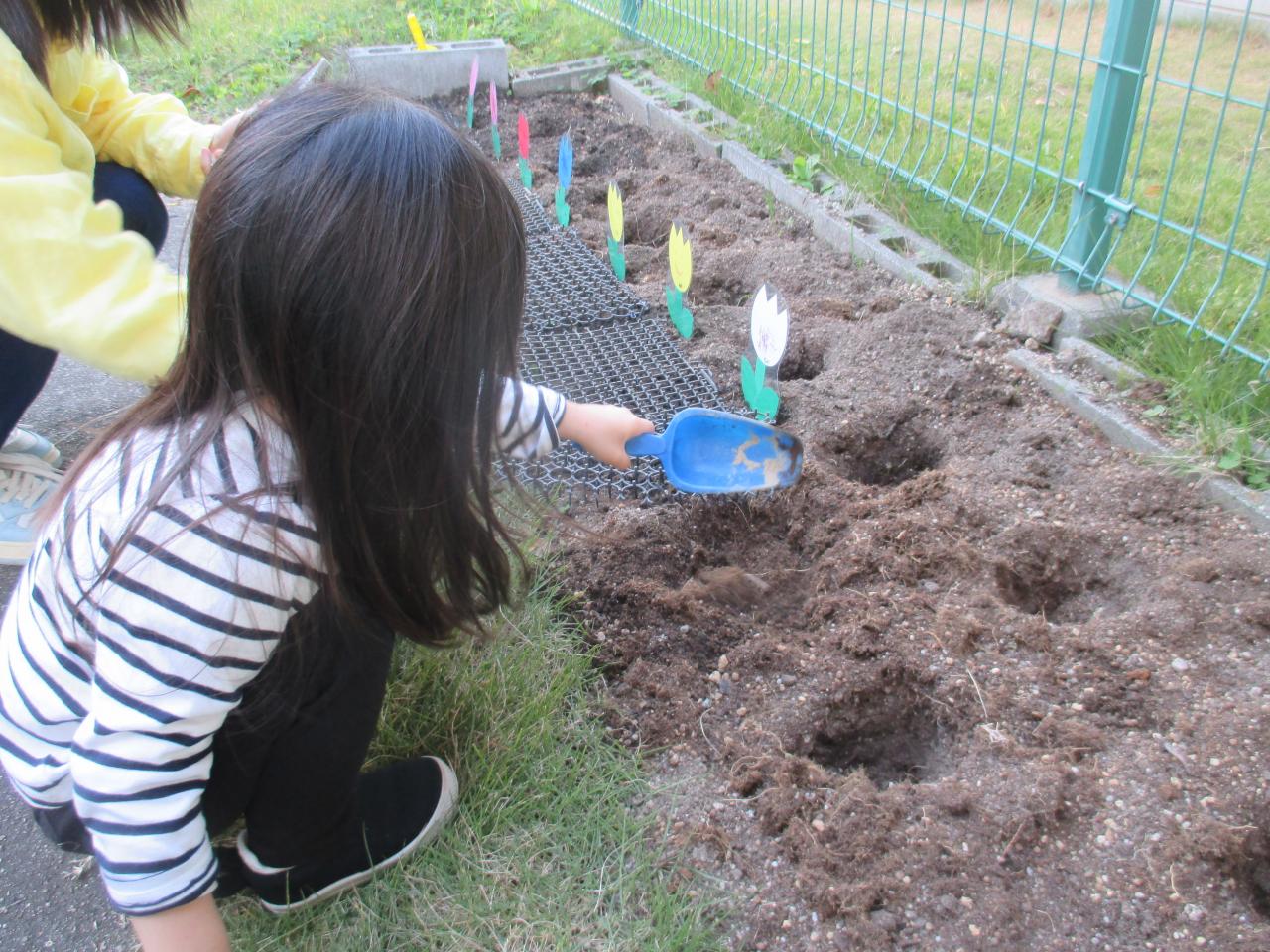 先週2回に渡ってセンターの花壇にチューリップの球根植えをしてもらいました。球根を自分で選んで、植えて、土のお布団を着せ、お水やり。