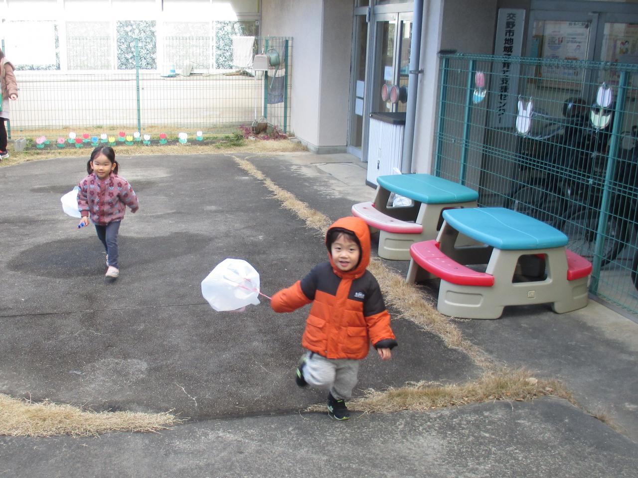 最後はレジ袋にクレヨンで絵を描いて作った凧をお庭で揚げました。