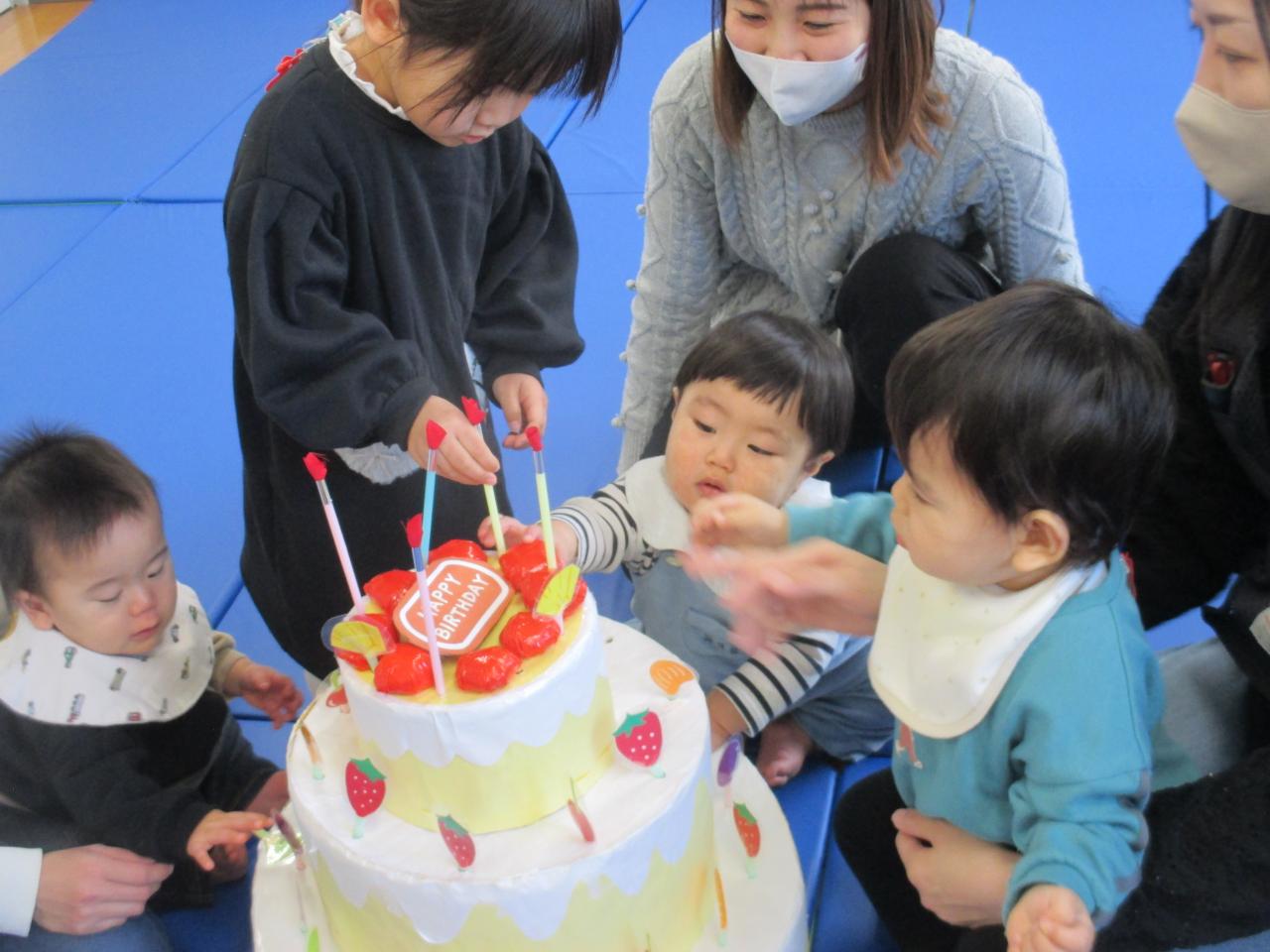 お誕生日のパネルシアターを見たり、ケーキの手遊びをして楽しみました(^^♪
