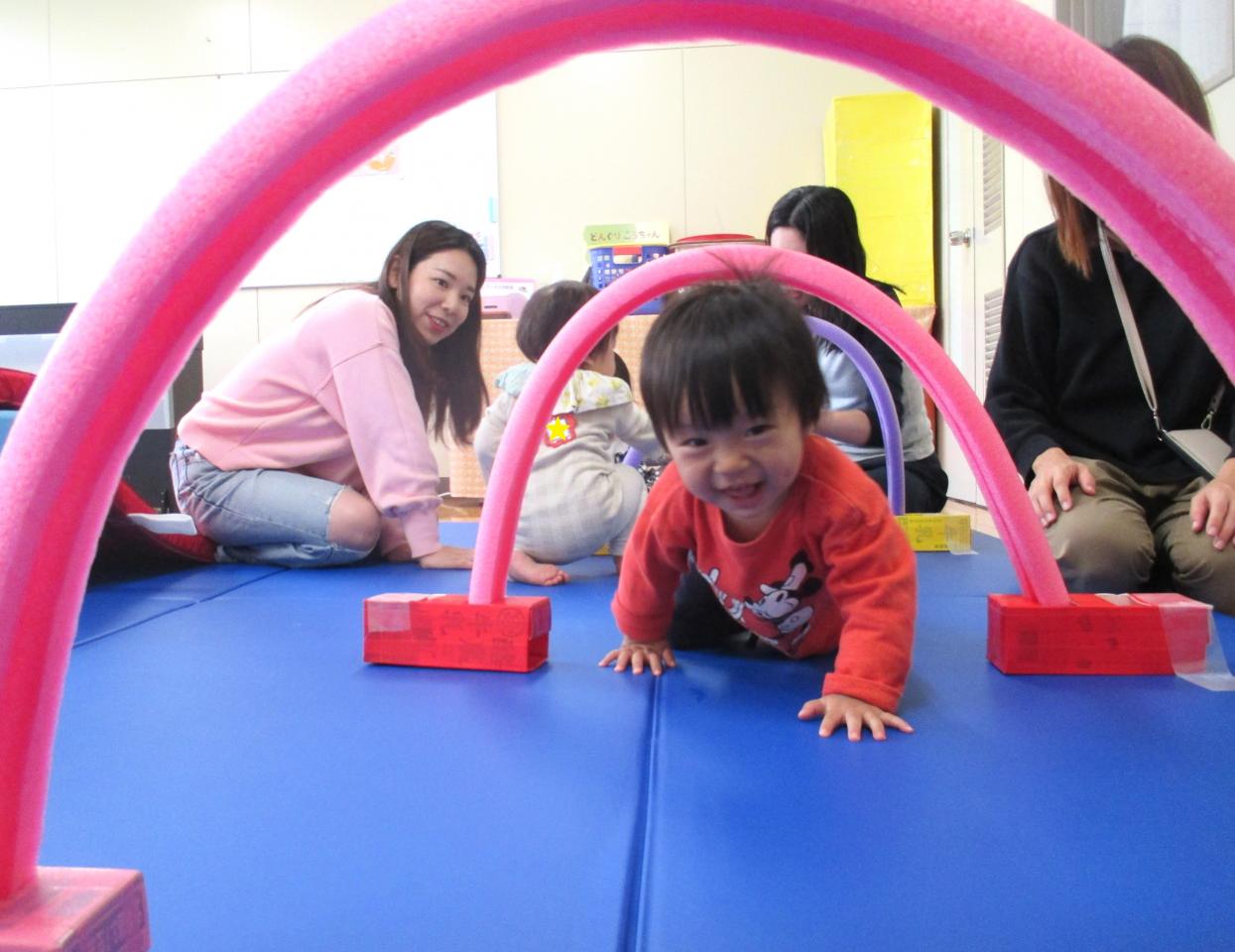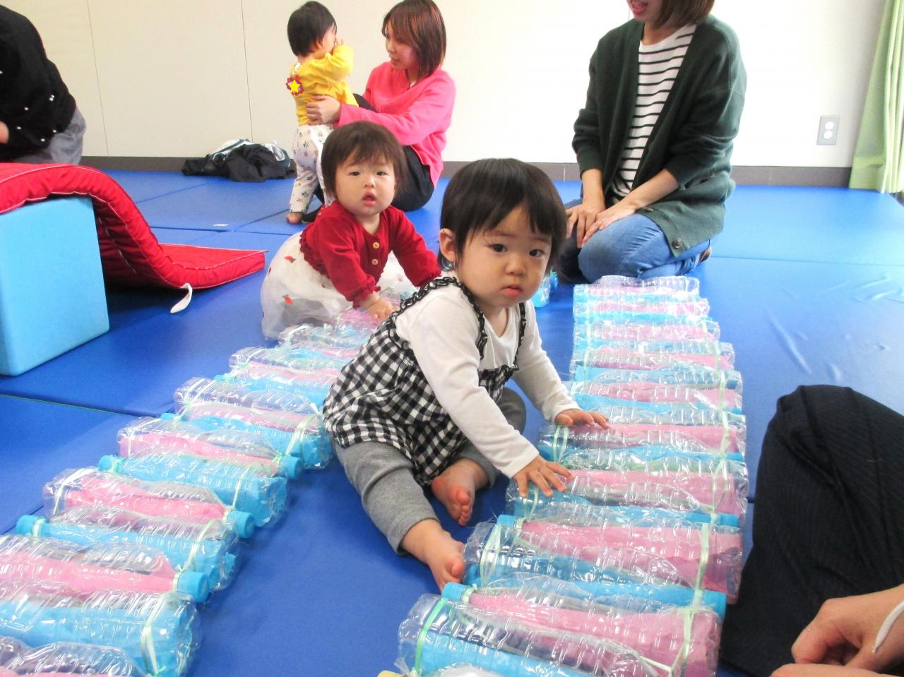 トンネルやマットの山登り、ペットボトルの橋など、体をたくさん使って遊びました♪