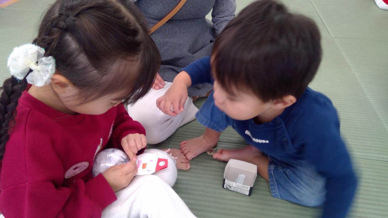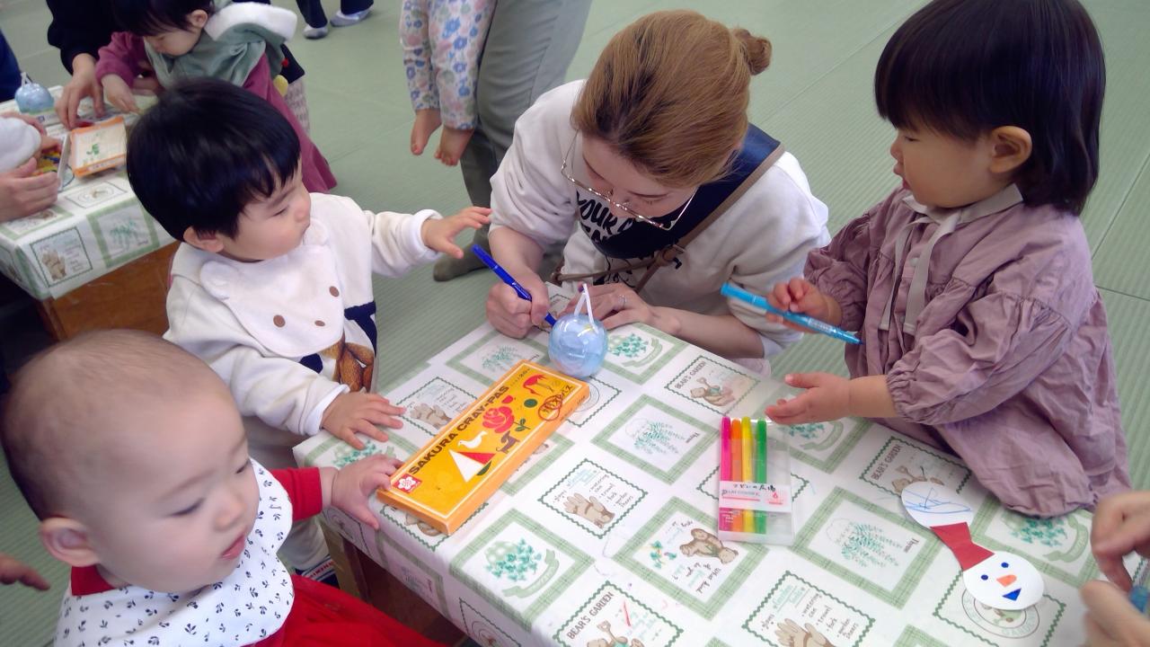 12月17日(水)クリスマスイベントがありました☆雪だるまの起き上がりこぶしを作りました♪ママやパパと一緒にカラーペンやクレヨンで雪だるまのお顔を描いてキラキラシールを貼って可愛い雪だるまを作りました♪ゆらゆら揺れたり、倒しても起き上がってくる様子を楽しんでいました☆